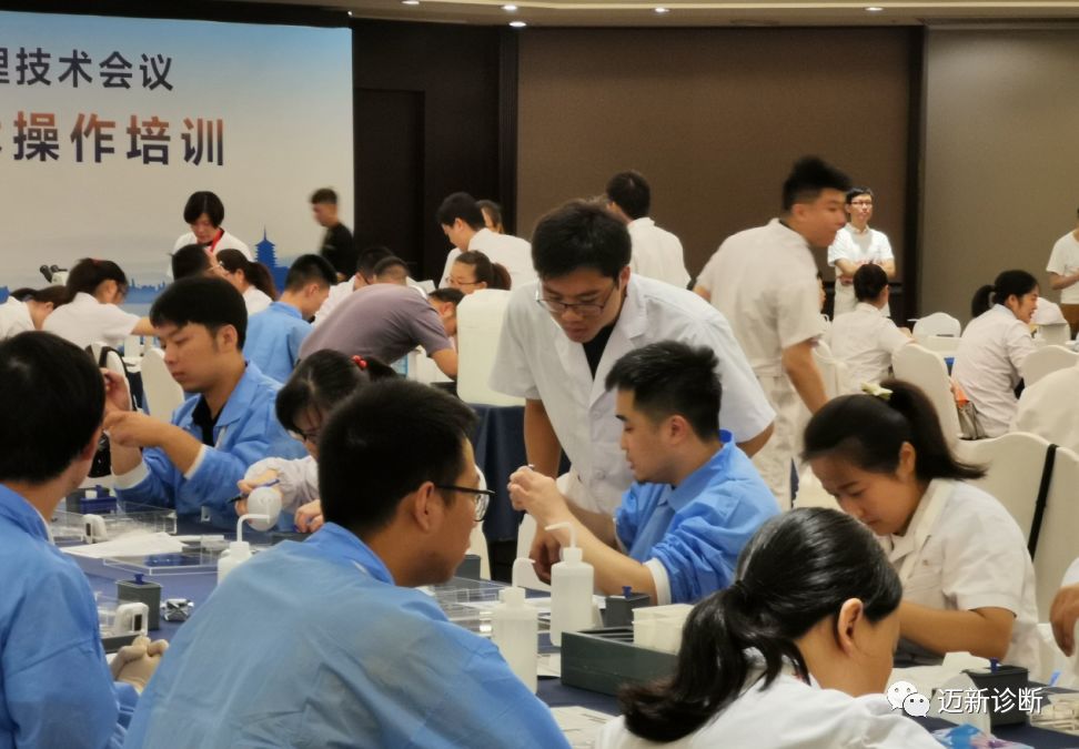 迈新受邀参与此次免疫组化实操培训活动并负责现场两个小组48名学员的技术带教工作。为更好的完成此次培训任务,迈新公司技术部同事在筹备期间做了大量而充分的准备,功夫不负有心人,经过专业的技术指导,严谨规范的技术操作,迈新组48位学员成绩全部合格,并且在本次染色操作中被评定为优秀的29位学员里,有12位来自于迈新带教的小组。