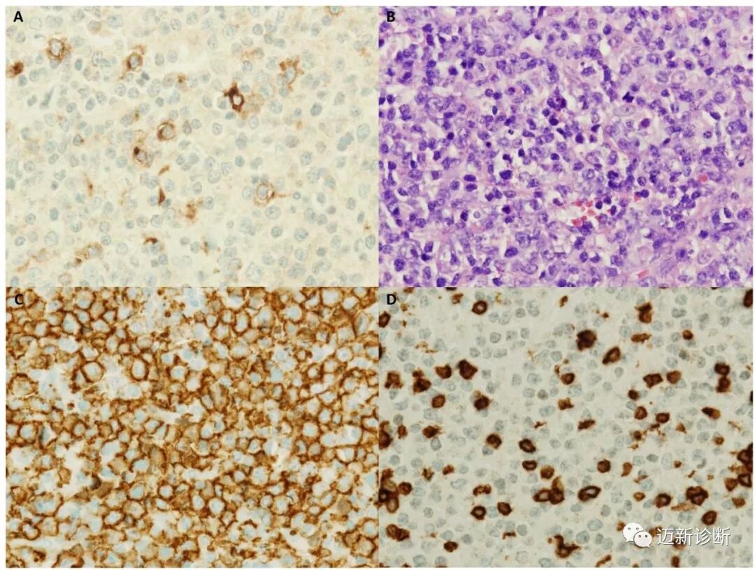 图4. 本例为弥漫大B细胞淋巴瘤,图A、C、D分别为CD30、CD20及CD3。