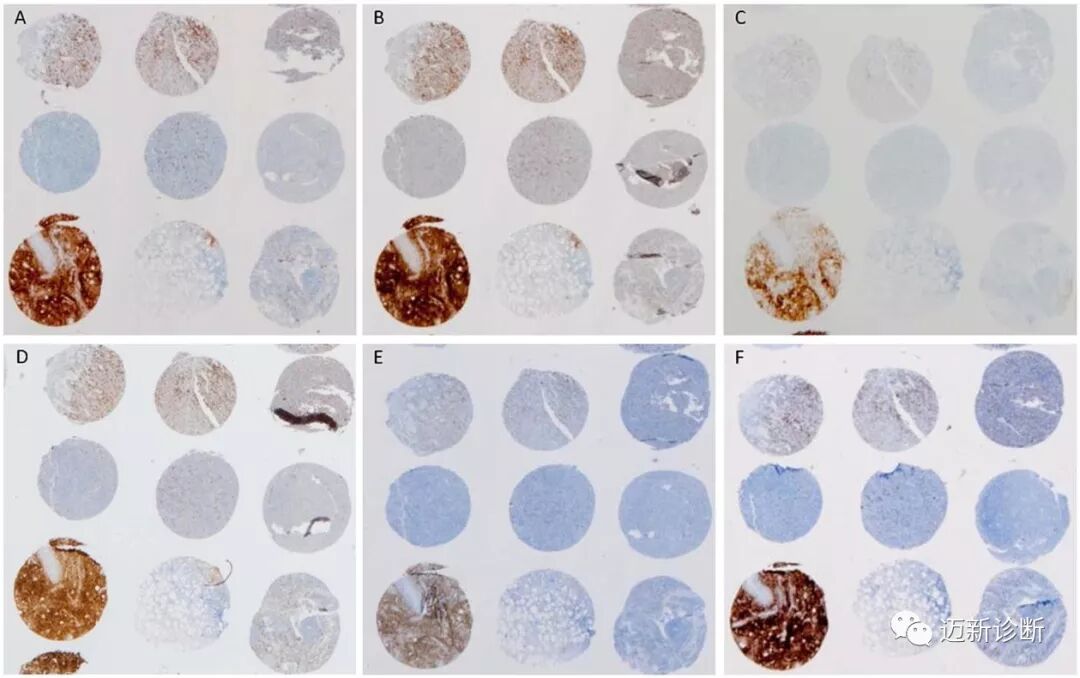 5个病理实验室通过不同的免疫组化机器、应用不同克隆号的抗体对组织微阵列切片进行CD30检测。即使同一克隆号的情况下,染色结果也有显著差异,阳性细胞百分比方面的配对一致性为46%;染色强度方面的配对一致性为56%。