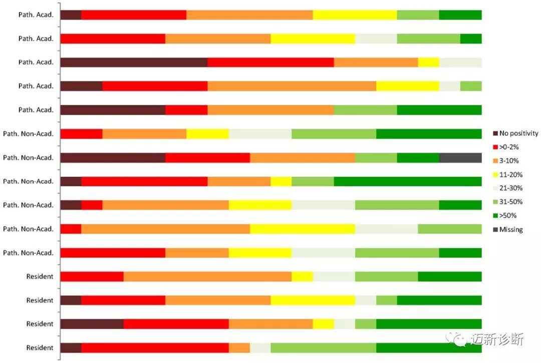 选择2%与10%阳性作为阈值,一致性结果相对较好(阈值为2%时的一致性为78%,阈值为10%的一致性为76%)。阈值为2%时,20个病例中有5例被所有医师均判为阳性;阈值为10%时,20个病例中仅有6例达到了意见一致(3例CD30阴性、3例CD30阳性)。由于CD30结果涉及治疗决策,因此所选阈值不同、进而结果不同会影响患者是否可以纳入相关临床试验。如图4中病例,阈值为2%时,15位医师有11位判断为CD30阳性;而阈值为10%时,15位医师中仍有11位判断为CD30阳性。