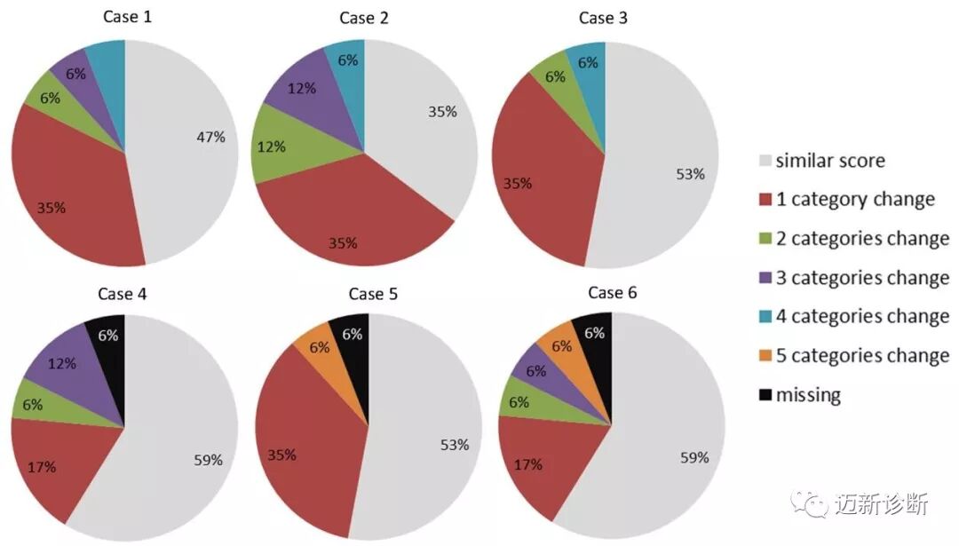 图2. 专家讲解前后,第2轮中的6例免疫组化结果解读出现了较大差异,有些甚至是跨几个结果范畴的改变。