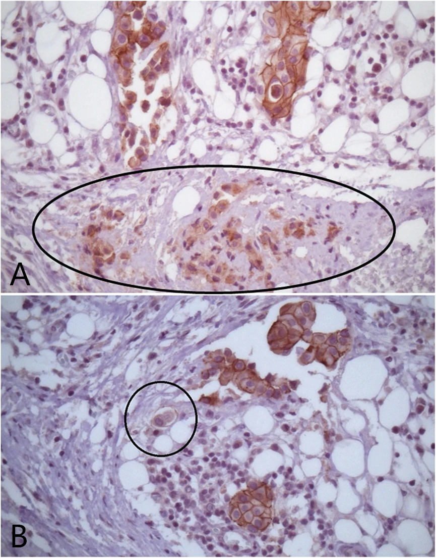 图7A和7B显示PUC出现E-Chaderin表达缺失(细胞膜阴性)