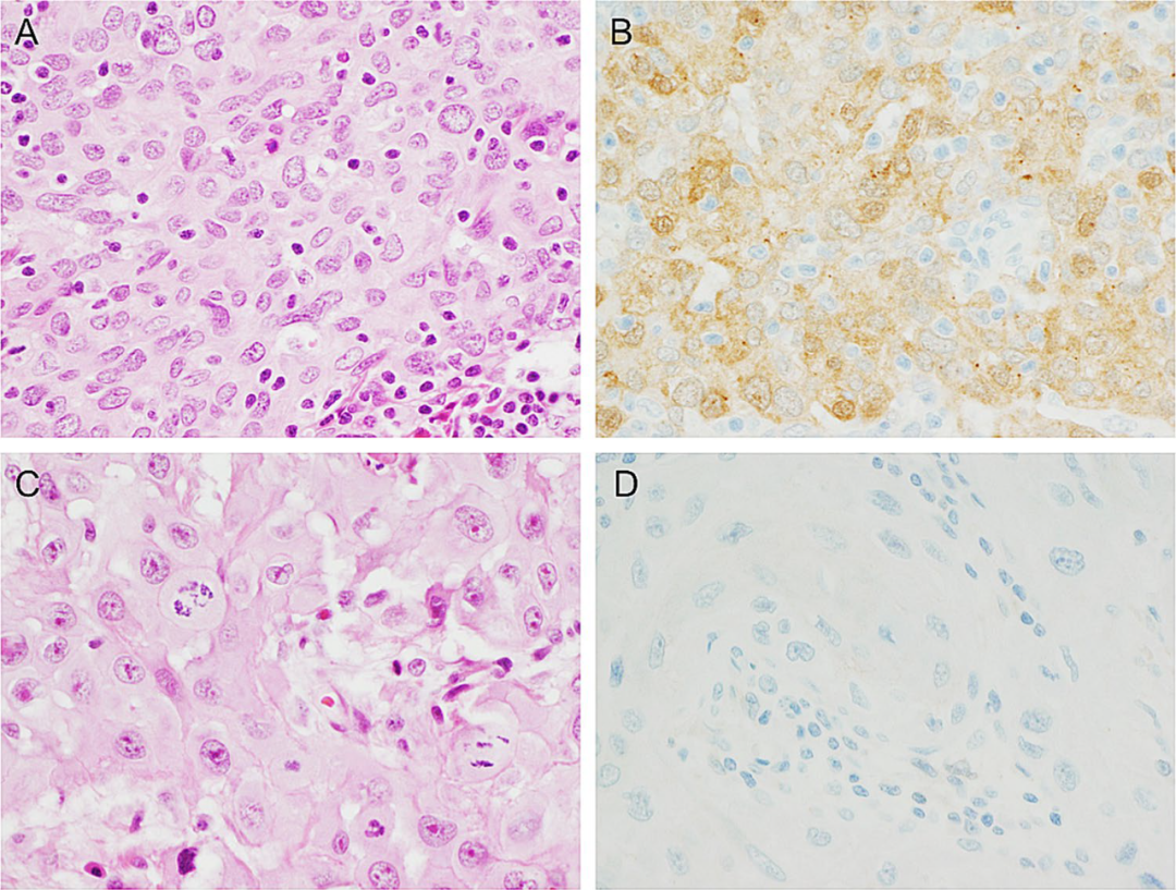 图2. 头颈部原发鳞状细胞癌中galectin-3的免疫组化结果:(A)galectin-3阳性的口腔原发鳞状细胞癌;(B)免疫组化galectin-3表现为大部分肿瘤细胞胞质着色、部分细胞核着色;(C)galectin-3阴性的口腔原发鳞状细胞癌供对比;(D)免疫组化galectin-3染色完全缺失。