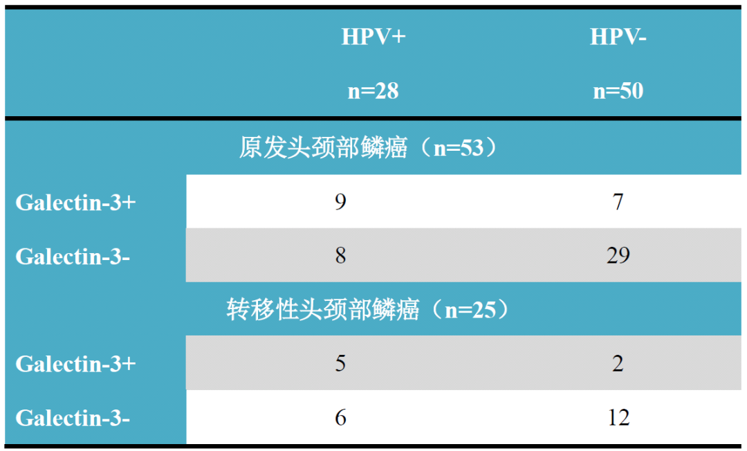 为更好的了解galectin-3在头颈部鳞状细胞癌进展及免疫靶向中的意义,弗吉尼亚大学病理专家Coppock等人评估了原发头颈部鳞状细胞癌、局部淋巴结转移的头颈部鳞状细胞癌中galectin-3表达于HR-HPV的关系。目前相关文章已发表于《Head Neck Pathol》杂志。该研究共收集了78例原发及局部淋巴结转移的头颈部鳞状细胞癌病例,制作组织微阵列后通过HR-HPV RNA ISH的方式进行了HPV的评估,同时通过免疫组化的方式对galectin-3的表达进行了评估。结果表明原发头颈部鳞癌中HPV阳性者17例,HPV阴性者36例;转移性头颈部鳞癌中HPV阳性者11例,阴性者14例。免疫组化检测表明,所有头颈部鳞状细胞癌病例中肿瘤细胞胞质阳性表达≥5%的病例比例为29%(23/78),具体详见表1。