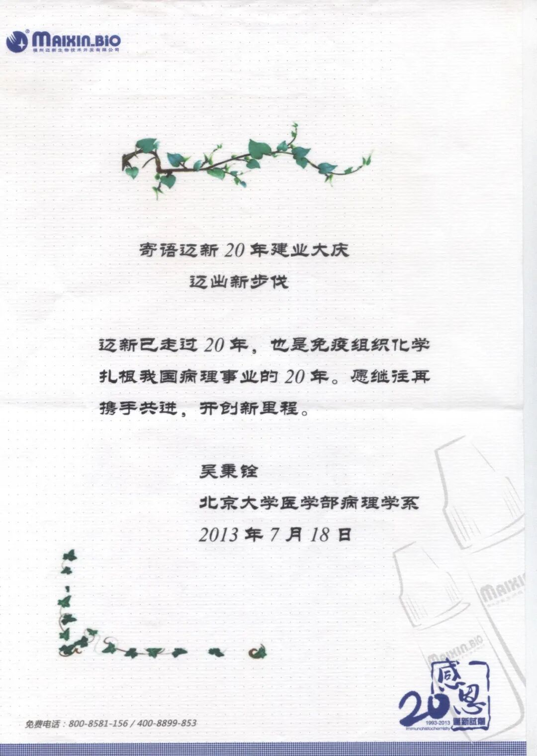 吴秉铨教授,作为病理人,他硕果累累;作为教育家,他桃李天下。纵然时间没能挽留下吴教授,再为病理事业多奉献几年,但他却用有限的生命,投入到无限的他所钟爱的病理事业中去。于中国病理而言,吴秉铨教授是深耕六十余年的推动者、拓荒者,取众家之长,吐纳新知识、新理念,果敢探求真理,使得病理的疆土愈发开阔拓展;于迈新而言,吴秉铨教授则是身边不可或缺的师傅,是心中无可比拟的偶像,是远方独一无二的导师。犹忆迈新成立二十周年时,吴教授以常春藤做比,寄语迈新能像常春藤一样,时刻焕发青春和活力。五年前,一堂题为“迈新的历史使命与责任”的演讲,吴教授更是以全新的视角向迈新呈现一幅行业发展、技术变革的历史画卷,以其自身夯实的专业知识、新颖的演讲方式,强大的责任感与使命感引发迈新人对如何承载中国病理梦;如何能更好地协助病理医生做正确/精准的诊断;如何做出的创新性研究和变革转型的深思。吴教授的谆谆教诲历久弥新,对迈新人“保持求知若饥,虚心若愚心态,用最佳的状态来迎接中国病理事业的灿烂明天”的寄语也一直是全体迈新人多年来共同努力的出发点和驱动力。斯人已逝,睹物思人常入梦,训言在耳犹记心。迈新过去每一个熠熠生辉的瞬间,都有吴教授的陪伴;迈新即将开始的璀璨未来,每一刻也必带着吴老先生的期许。此刻,让我们一同回顾,吴教授同迈新一同度过的难忘时刻。吴教授寄语迈新,继往再携手,开创新里程